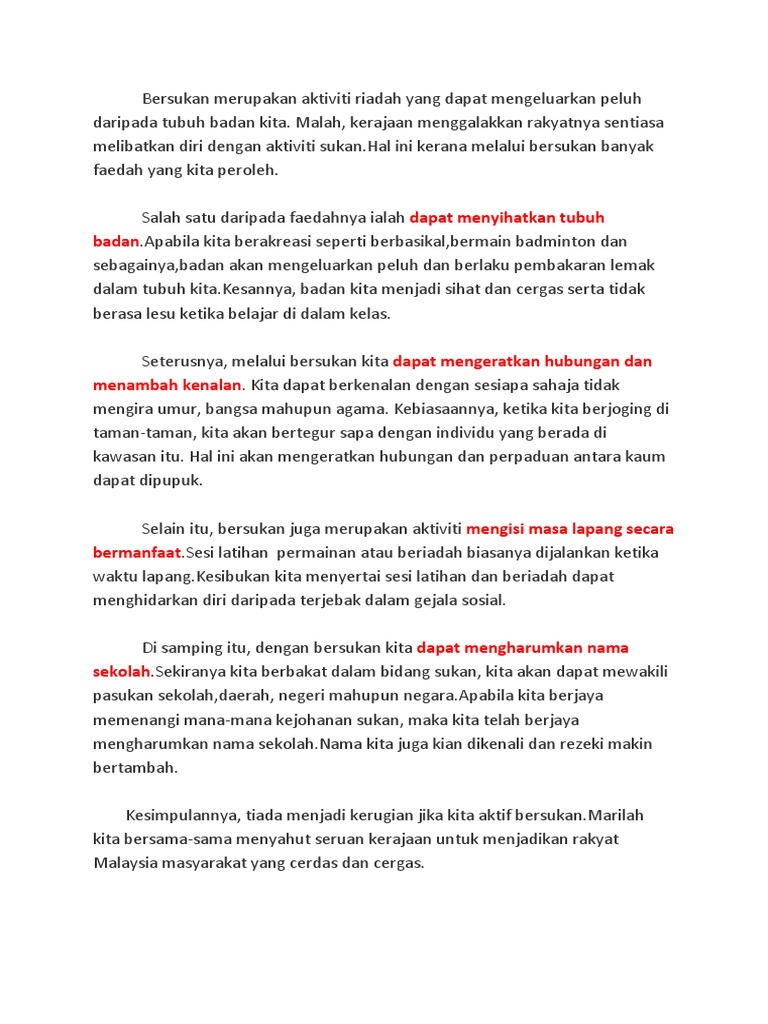 Karangan Sukan Sebagai Alat Perpaduan : Kerangka karangan sementara atau non formal merupakan suatu alat bantu, sebuah penuntun bagi suatu tulisan yang terarah.. Di samping itu, kita sering mendengar ungkapan bahawa sukan merupakan wadah untuk perpaduan. Sukan juga menjadi salah satu daripada alat perpaduan di peringkat sekolah. Hampir semua ikan menggunakan matanya dalam aktivitas hidupnya, seperti memijah. Dapat berupa video, slide power point, dsb. Learn bahasa malaysia creatively from probably the most creative bm coach !